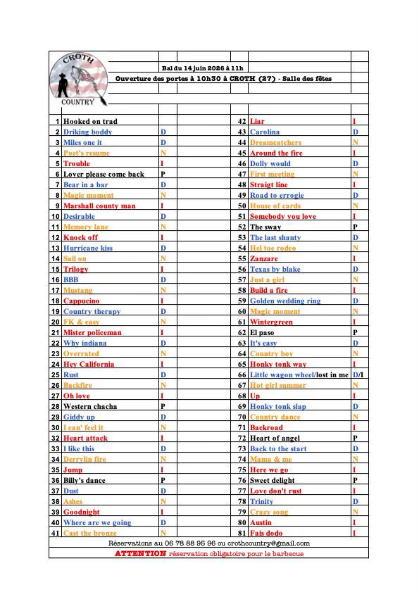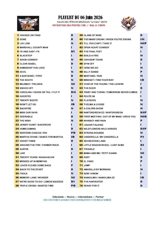 bal country et catalan le samedi 6 juin, animé par Valou à la salle socio culturelle le Patio 5 rue de Berg à BREZOLLES 28270. Réservation OBLIGATOIRE jusqu'au 2 juin inclus. buvette et pâtisseries sur place. ouverture des portes 18h45. début bal à 19h30. Entrée 7 euros. gratuit pour les moins de 12 ans. Sandwich sur commande à la réservation.